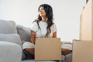 Hispanic woman with cardboard box looking away sitting on sofa in living room at home