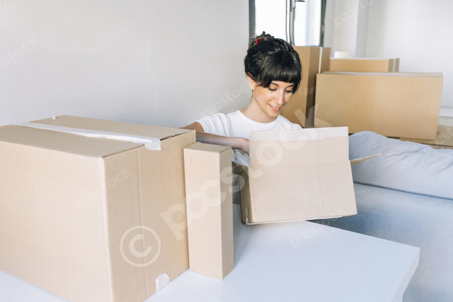 Smiling Hispanic woman with cardboard boxes sitting at table in living room at home