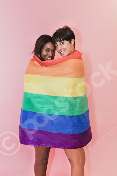 Hispanic lesbian couple hugging each other standing on city bridge during daytime