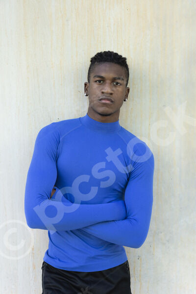 Black man in kaftan looking away holding orange lying on blue wall outdoors on sunny day
