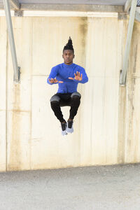 Hispanic and Middle Eastern business women jumping with outstretched arms in front of building on footpath in city during sunny day