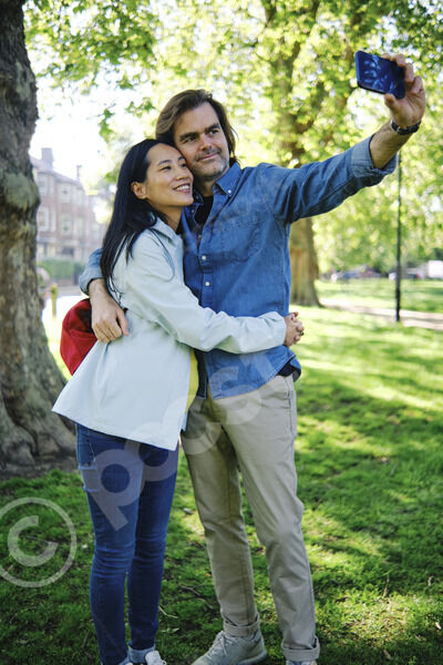 Hispanic boyfriend in pouty lips sitting on chair taking selfie using smartphone with Black girlfriend standing and hugging him from behind near table with laptop at home