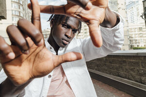 Cropped image of Black and caucasian lesbian couple reaching for each other against pink background in studio