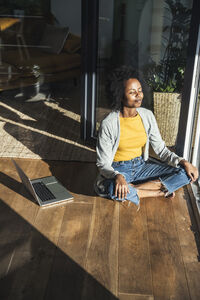 Chinese woman freelancer wearing dress working on laptop looking away sitting on couch in terrace at home during daytime