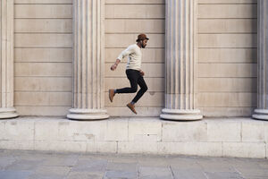 Black man with hands in pockets looking away holding jacket while leaning against stone wall outdoors