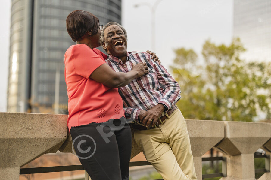 Hispanic business woman with orange hair flexing arms looking up while standing in office park