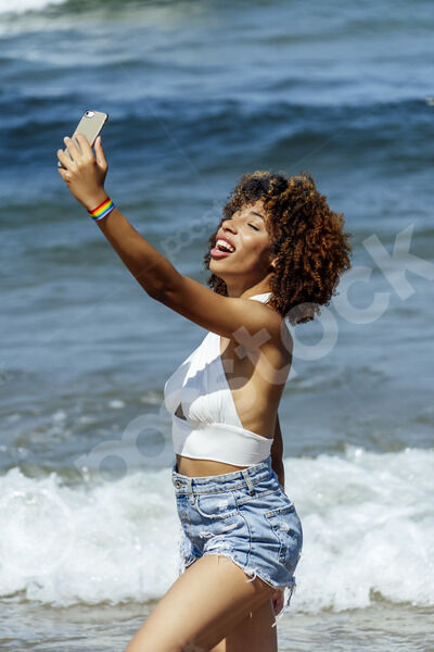Black woman holding and watching on smartphone with male friends sitting close together against brick wall outdoors on sunny day