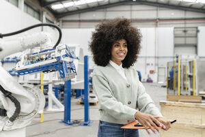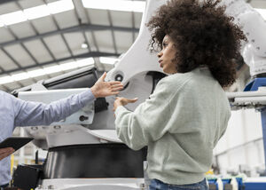 Mixed-race female engineer wearing hardhat discussing blueprint with caucasian male coworker holding laptop while standing in construction site