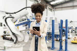 Mixed-race woman holding tablet next to caucasian boyfriend pointing up standing on city sidewalk on sunny day