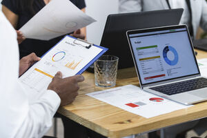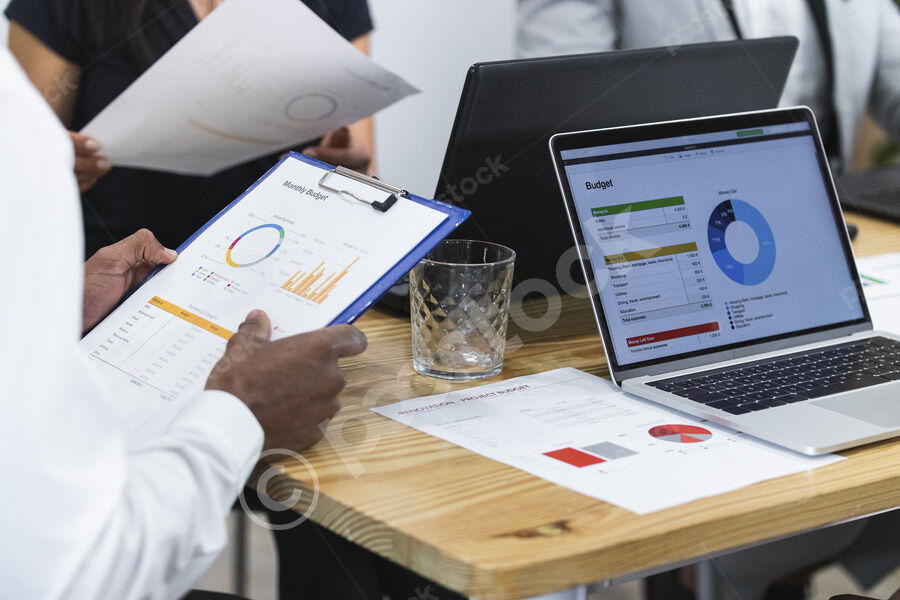 Cropped image of Hispanic businessman holding data on paper document while sitting at table with laptop beside workmate in office