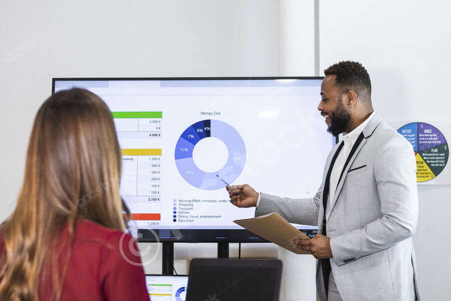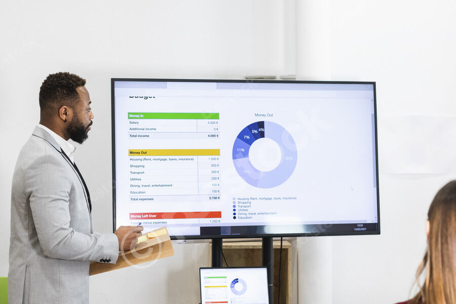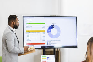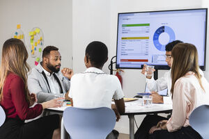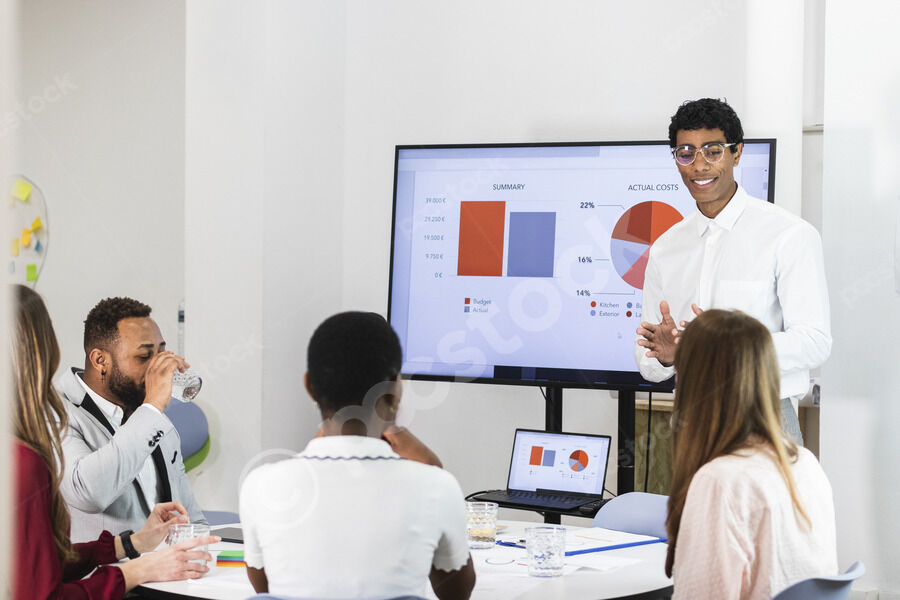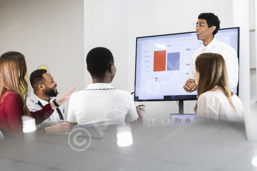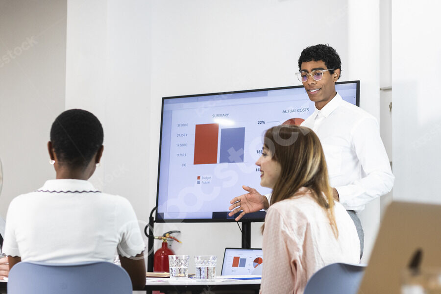 Hispanic businessman standing in front of workmates explaining plan over television during meeting in office