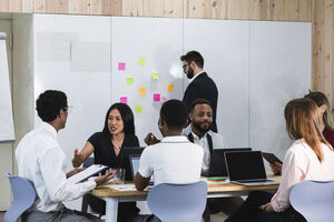 Diverse group of business people sitting at table together having discussion in a meeting at office
