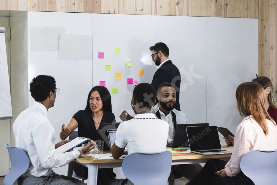 Hispanic businessman standing in front of workmates discussing during meeting in office