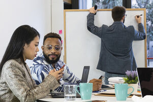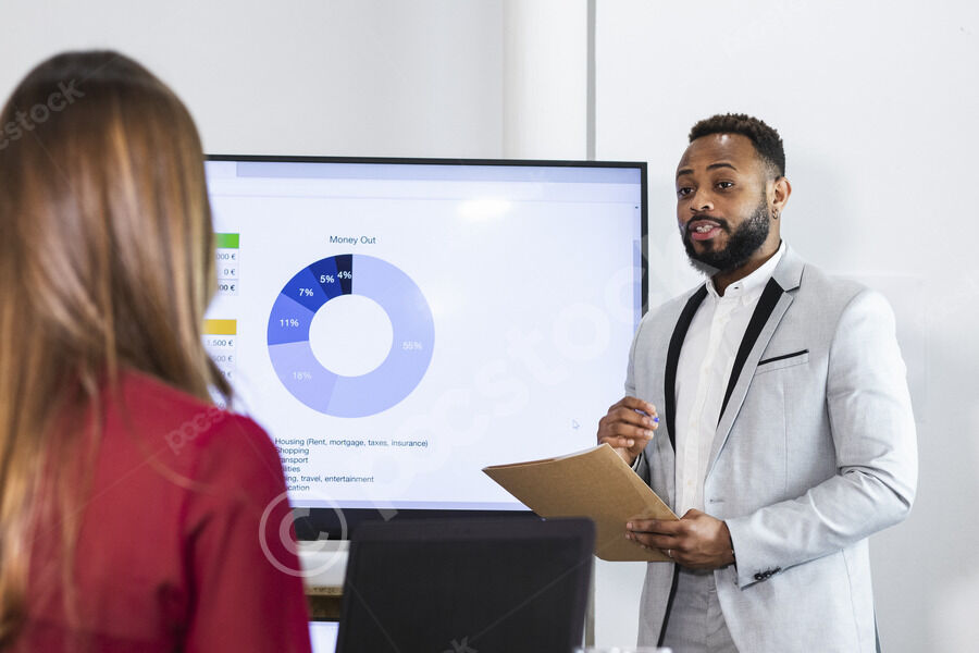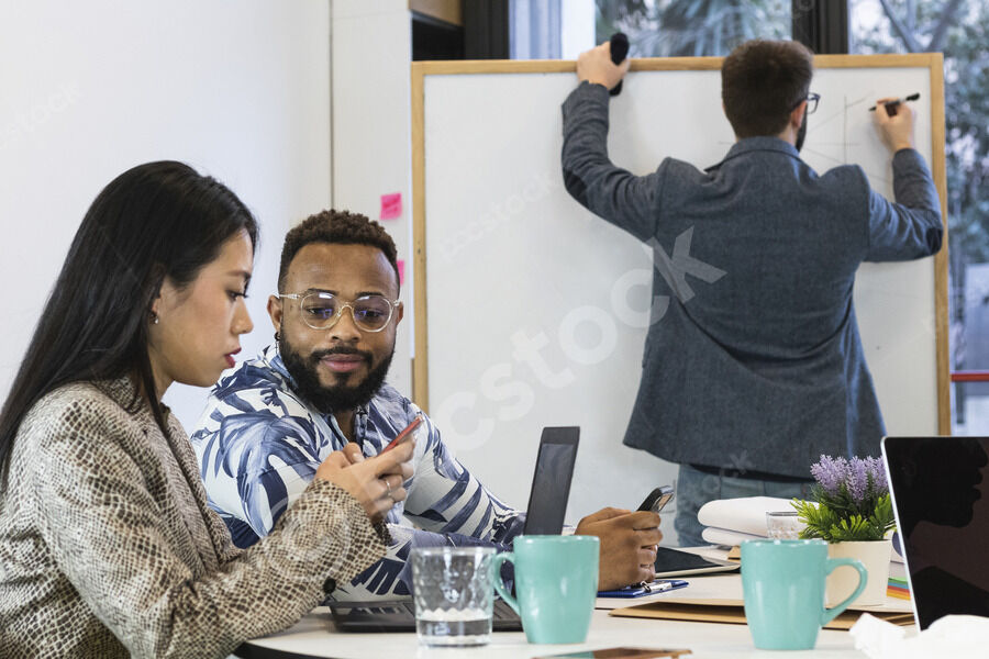 Black male business man with Chinese female workmate standing together in front of their office colleagues discussing during meeting in office