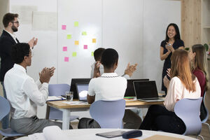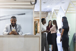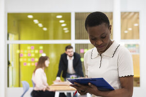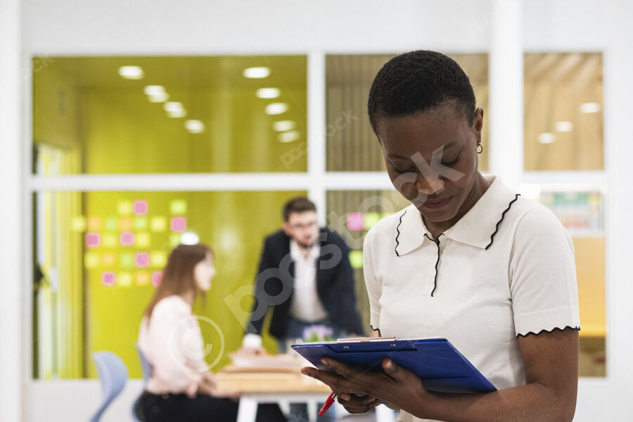 Smiling Black business woman with clipboard standing in front of workmates in office