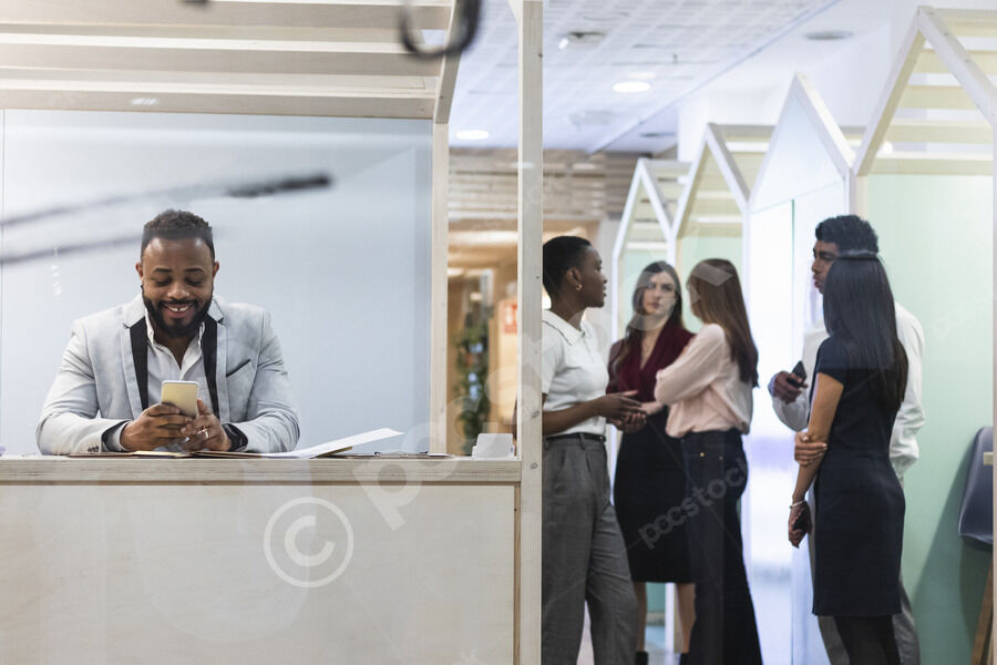 Smiling Black businessman with eyeglasses using smartphone while sitting at table in office