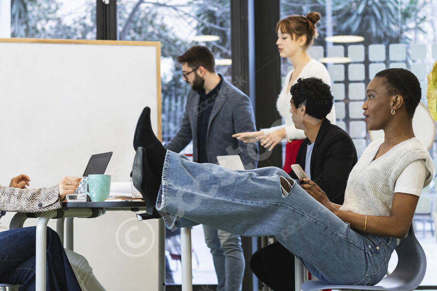 Businesswoman with mobile phone leaning legs on table with colleagues in background at office
