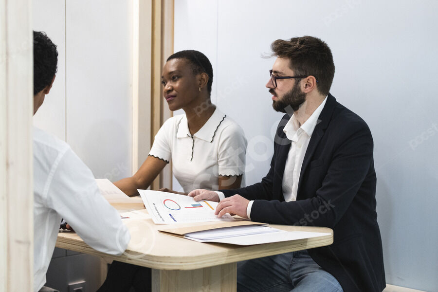 Black business woman discussing documents to Hispanic male workmate while sitting at table in office