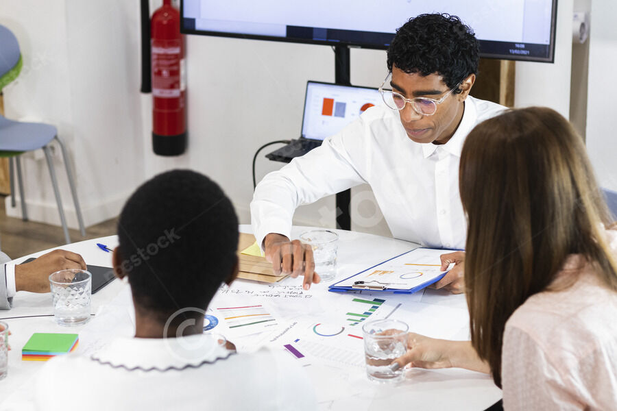 Hispanic businessman holding paper discussing with colleagues during meeting in office