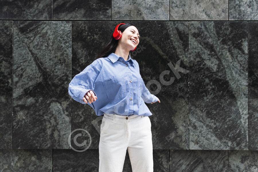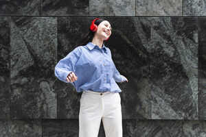 Smiling mixed-race business woman listening music through wireless headphones dancing in front of wall in city