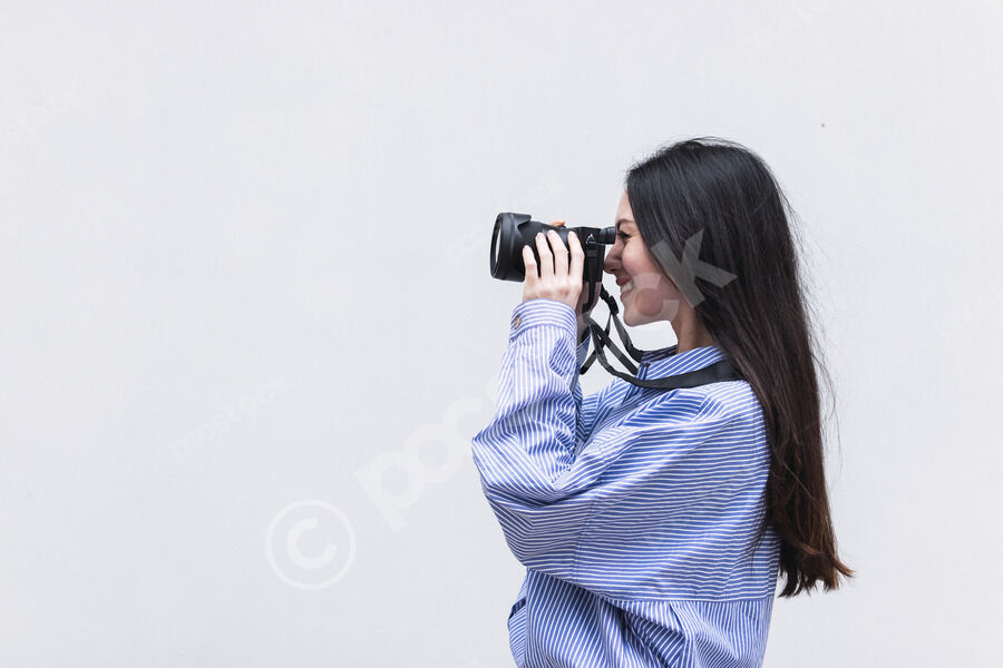 Mixed-race woman using camera standing in front of white wall outdoors