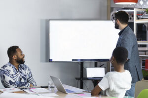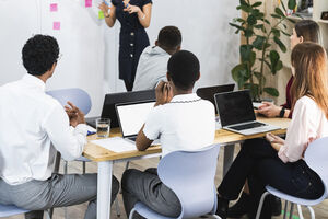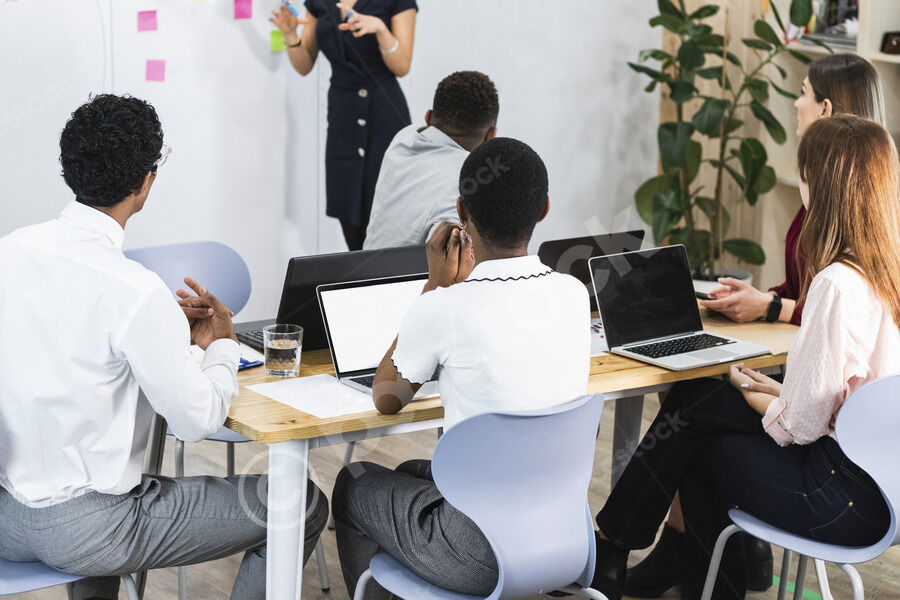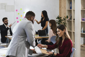 Chinese business woman writing on sticky notes on while standing beside workmate in office