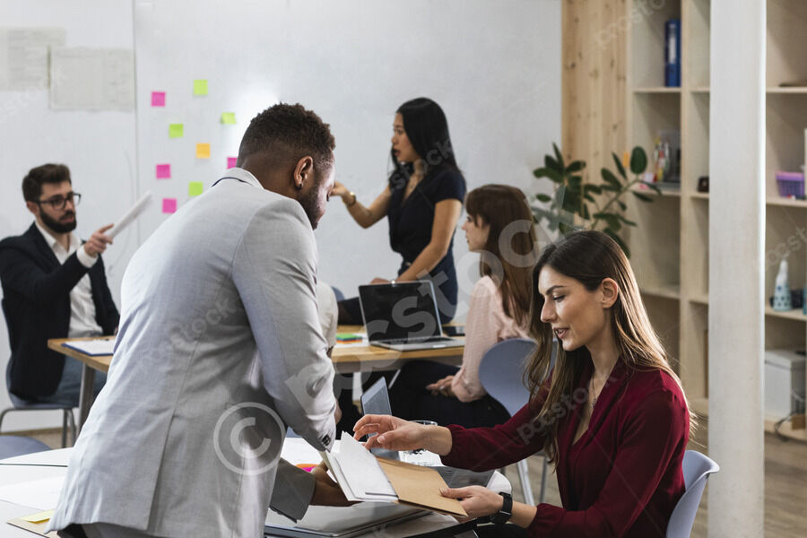 Male and female entrepreneurs discussing over documents with colleagues in background at office