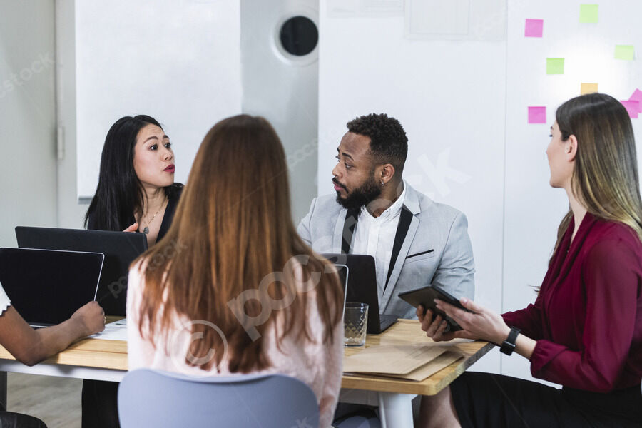 Top view of diverse group of business people having discussion while standing in office