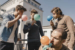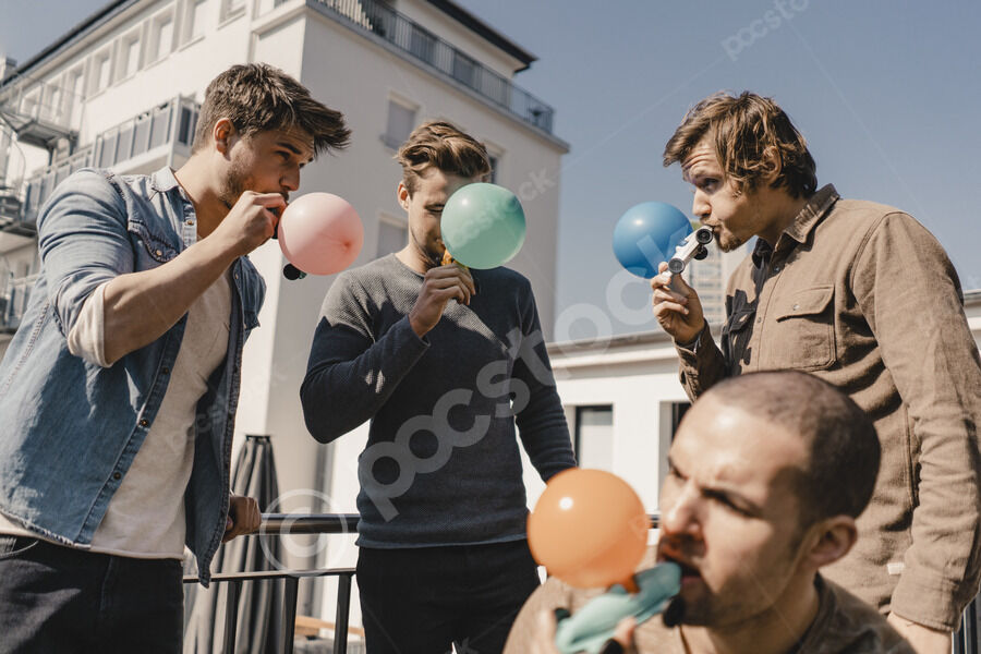 Diverse group of male friends blowing balloons while gathering on balcony on sunny day