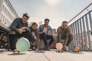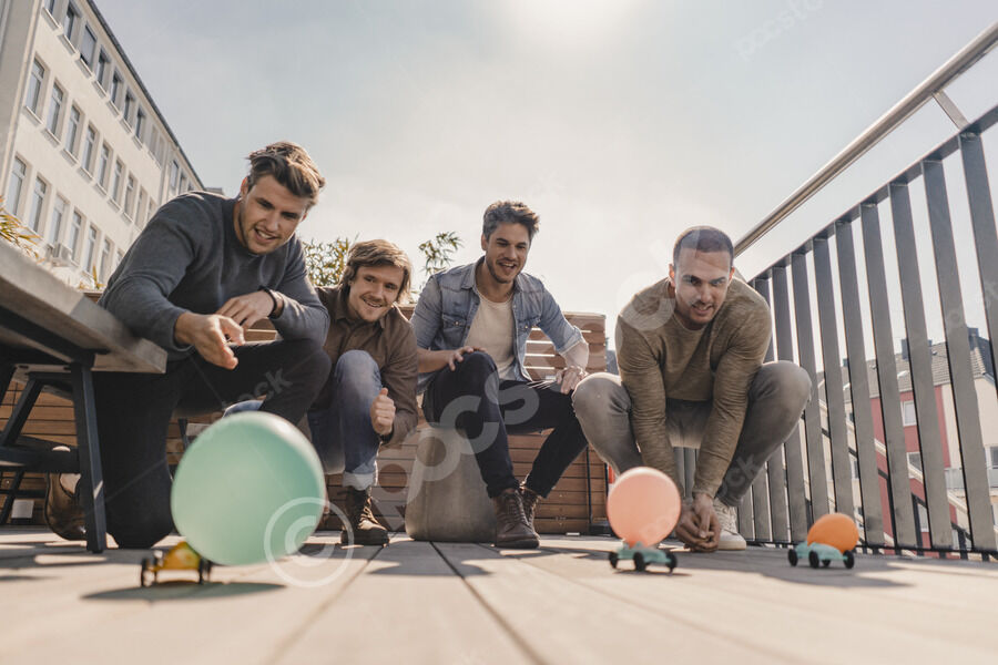 Group of diverse male friends making a toy car race with balloons on balcony on sunny day