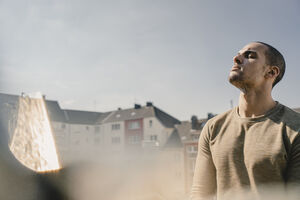Black man with mustache standing with eyes closed outdoors on sunny day