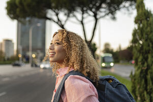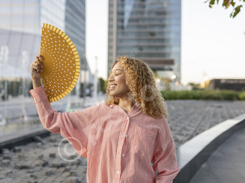 Hispanic business woman wearing headscarf looking up while standing with outstretched arms outside building in city on sunny day