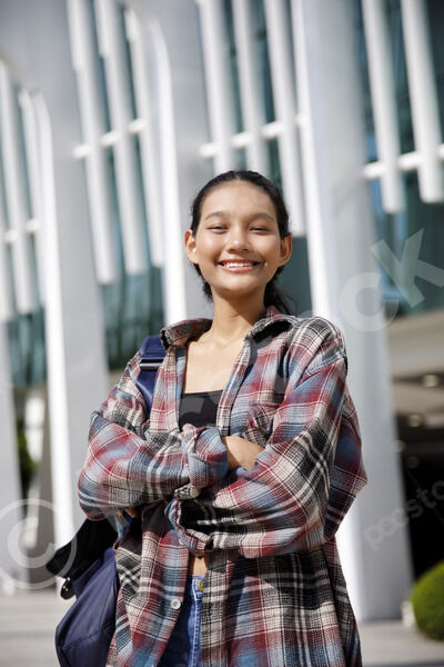 Hispanic female tourist wearing sunglasses holding hat standing with outstretched arms at bay during daytime