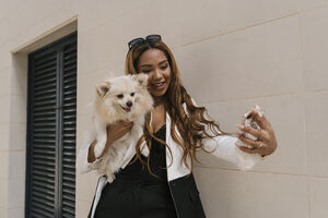 Middle Eastern woman with closed eyes holding smartphone standing in front of wall outdoors during daytime