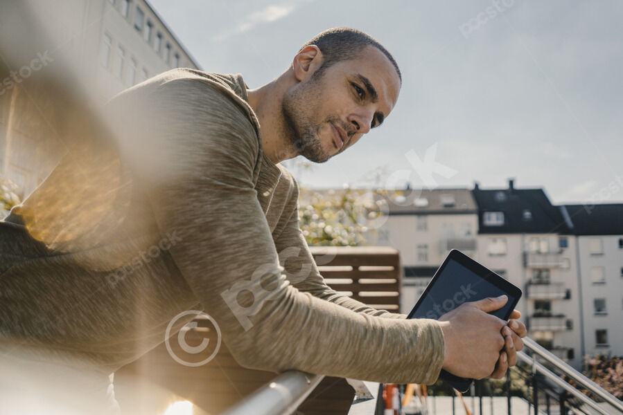 Middle Eastern man holding tablet looking away while leaning on balcony railing on balcony on sunny day