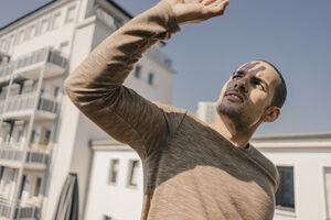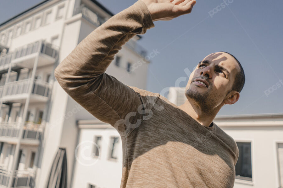 Middle Eastern man covering face with hand while looking at sun and standing on balcony on sunny day