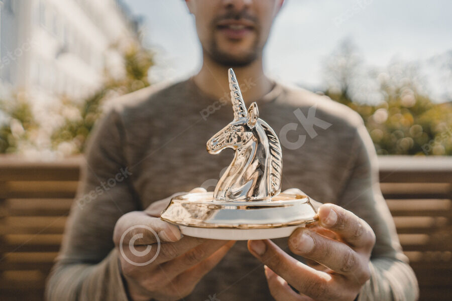 Cropped image of Middle Eastern man holding unicorn figurine while standing outdoors on sunny day