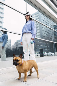 Smiling mixed-race business woman wearing virtual reality headset standing with dog on footpath in city