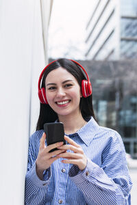 Smiling mixed-race woman listening to music through red headphones holding smartphone sitting at table in cafe