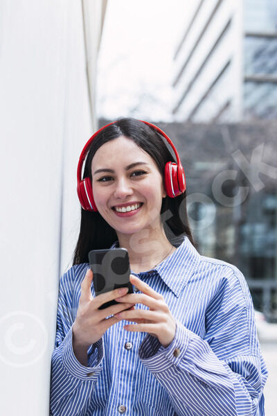 Mixed-race woman with curly hair wearing yellow jacket listening to music on headphones while standing in city