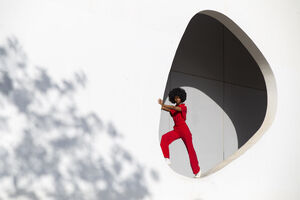 Afro European woman with hand in her hair wearing sunglasses standing against blue wall in studio