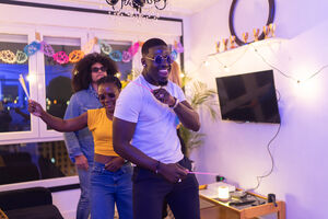 Diverse group of friends wearing sunglasses having fun holding glow sticks and dancing together at home party
