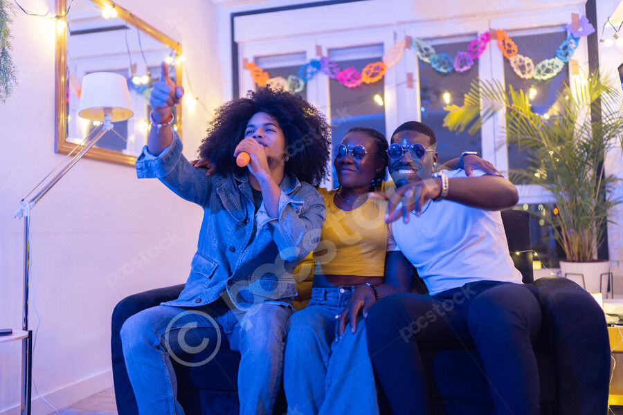 Hispanic man with afro wearing denim jeans and sunglasses sitting on sofa having fun singing karaoke with Black male and female friends during house party