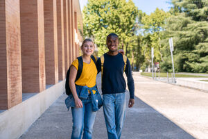 Black male student and caucasian female classmate talking while walking with their backpacks outside the university building on sunny day
