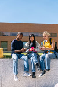 Diverse group of students using their smartphones while sitting together on bench outside university campus on sunny day
