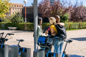 Diverse group of students renting electric bicycle using smartphone app while standing together on university campus on sunny day