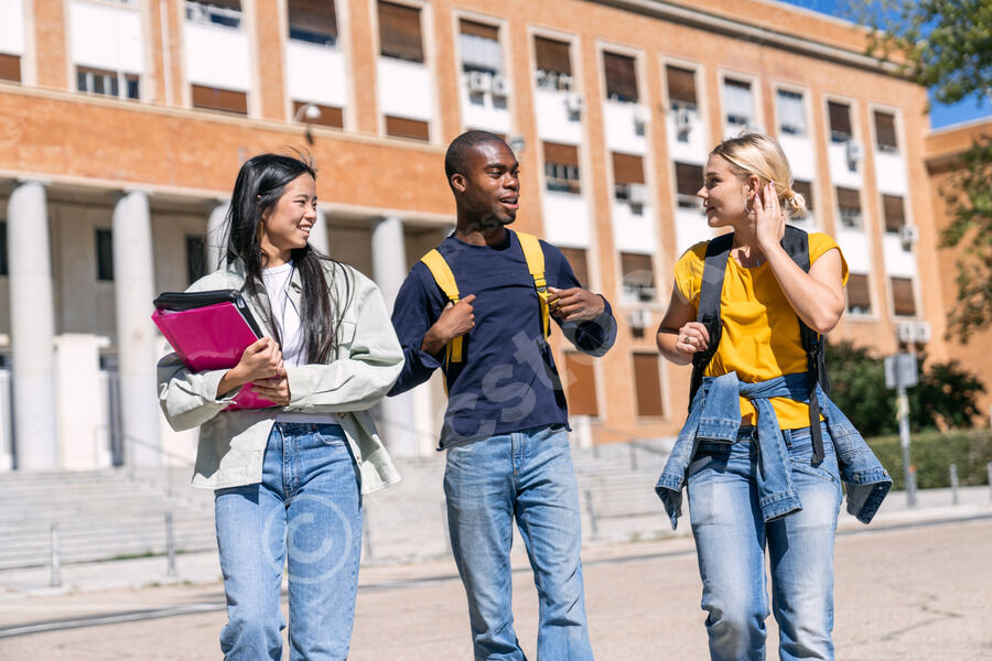 Diverse group of students talking while walking on pedestrian crossing on sunny day