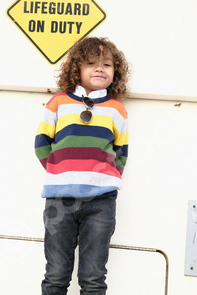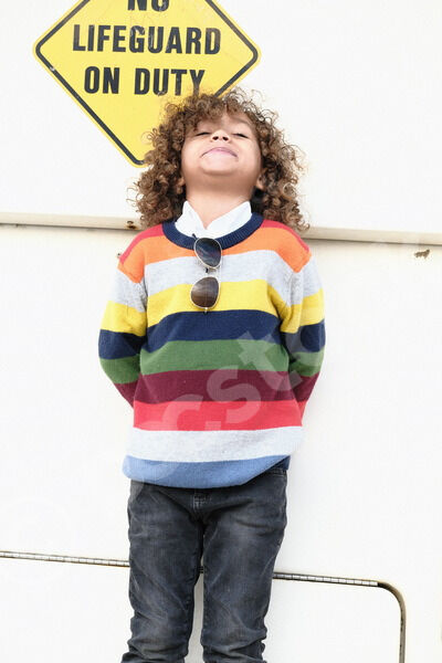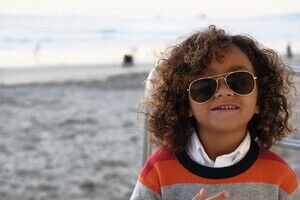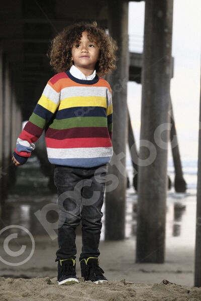 Smiling Mixed race little boy with curly hair standing under bridges on beach during daytime