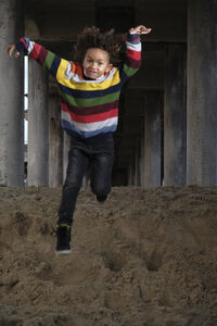 Mixed race little boy with curly hair jumping under bridges near beach during daytime