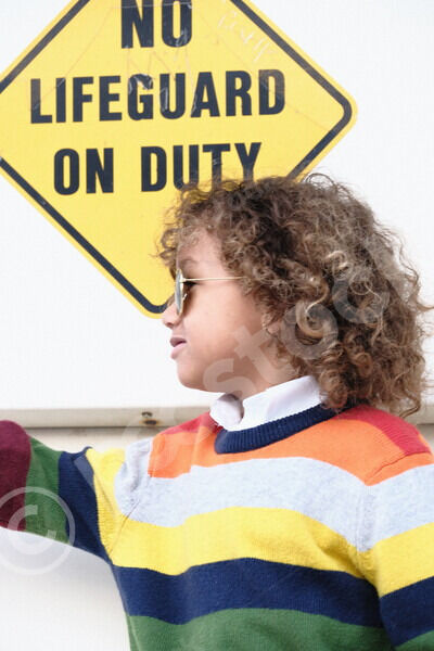 Mixed race little boy with curly hair wearing sunglasses looking up standing against wall with sign outdoors during daytime